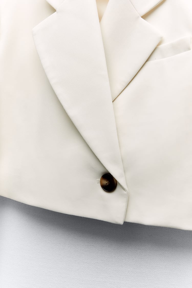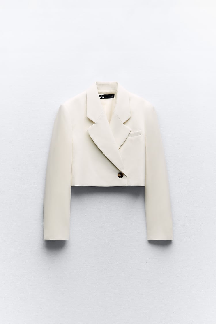 Blazer com gola de abas e mangas compridas, realçado por ombreiras. Os punhos são harmonizados. O fechamento frontal é cruzado, destacando-se pelos elegantes botões