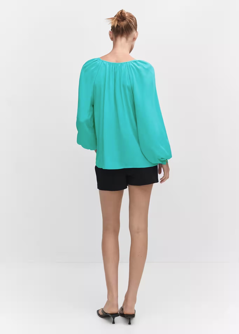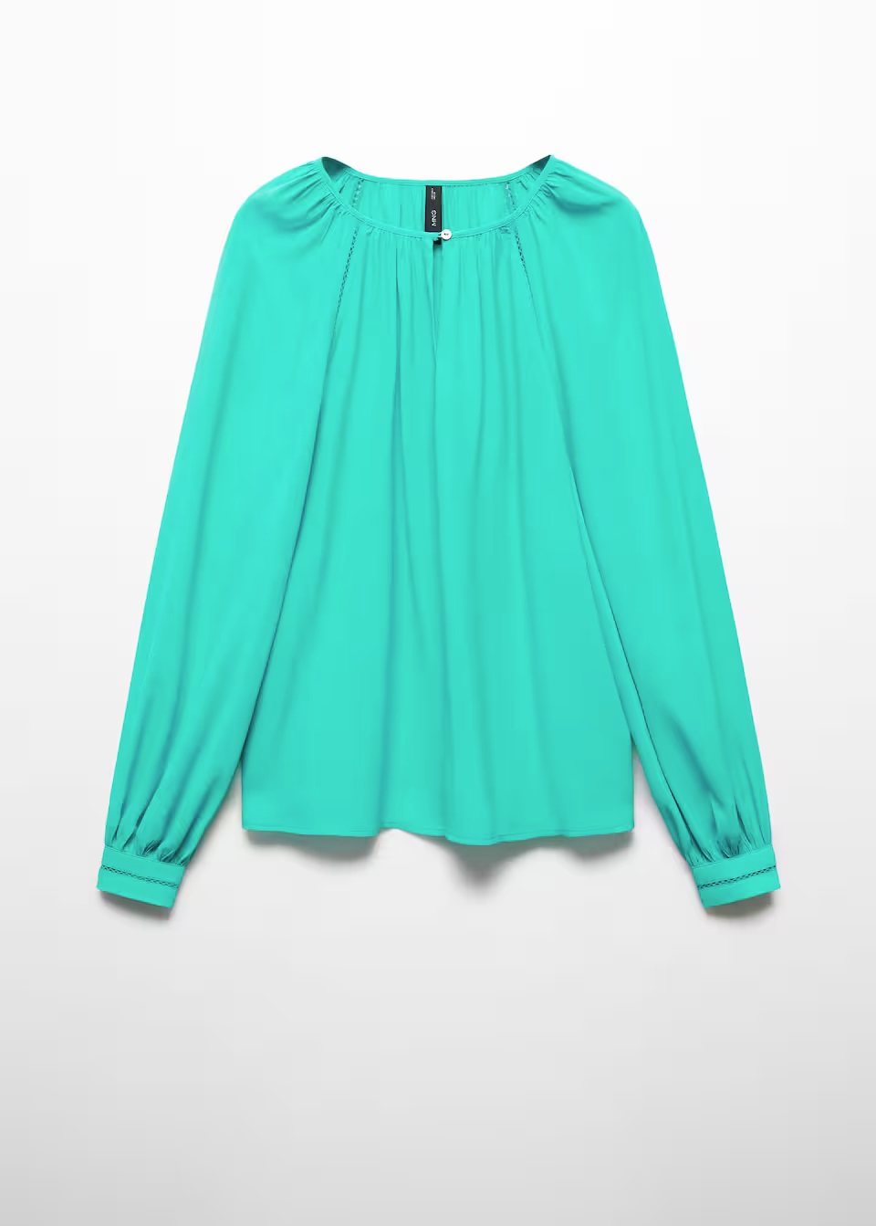 Tecido fluido. Design reto. Gola arredondada. Manga longa raglan. Detalhes vazados. Detalhes franzidos. Fecho com botões na frente. Visual de escritório.