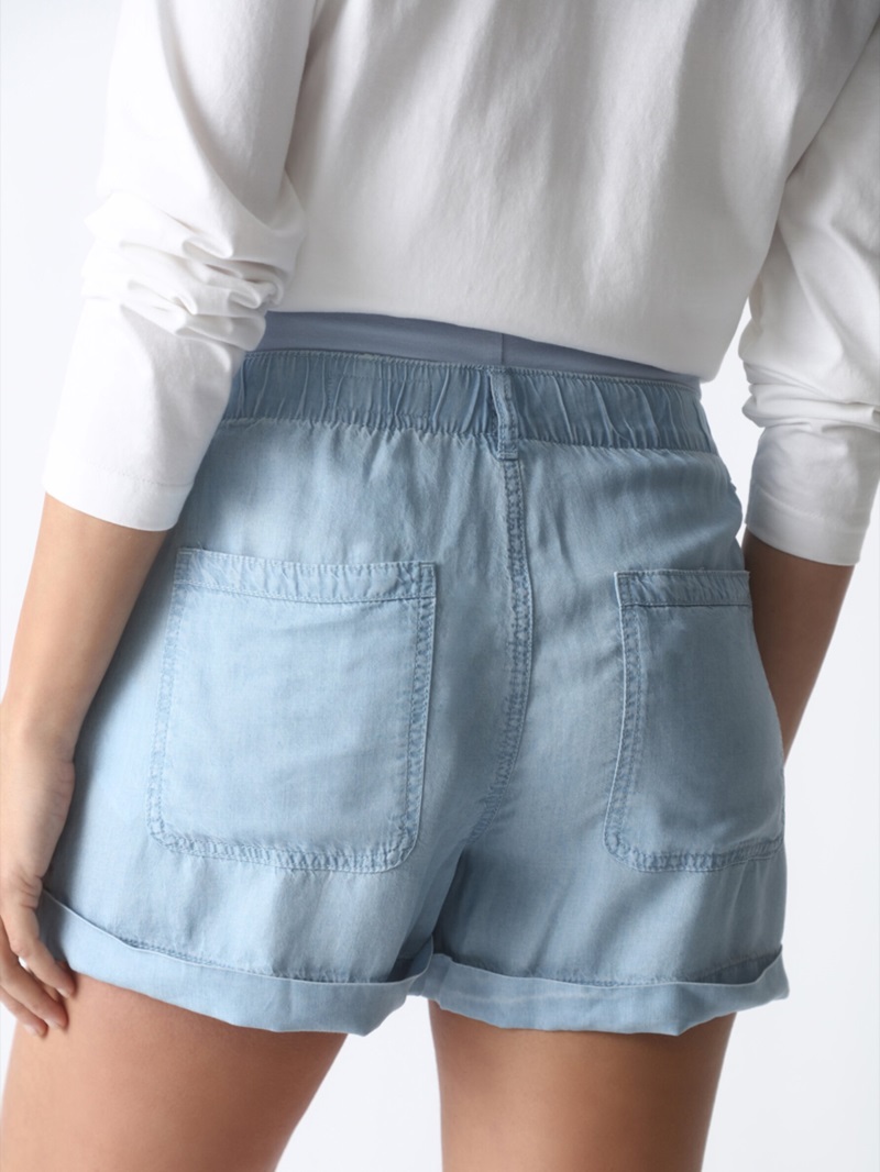 Calça curtas maternity tipo calções com cintura elástica. Conta com um elástico revestido na cintura com secção larga para um ajuste ótimo sobre a barriga e dois bolsos nos lados da peça de roupa. O seu tecido denim leve e o seu corte ligeiramente folgado fazem desta uma peça de roupa cómoda e versátil.