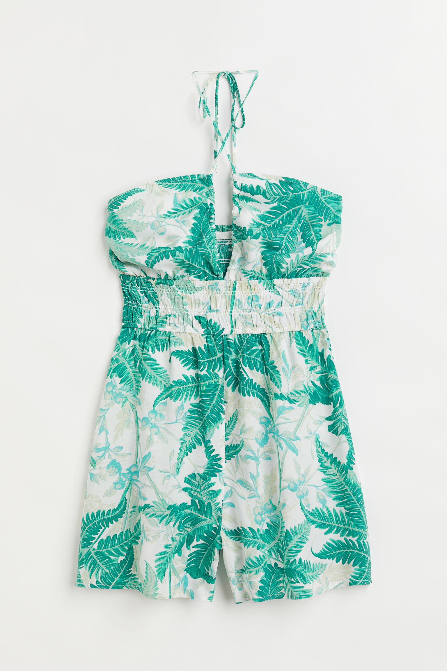 Macacão de comprimento curto, confeccionado em tecido de viscose, apresenta um elegante decote halterneck. O decote é realçado por um cordão de ajuste, composto por tiras finas que oferecem versatilidade no estilo e amarram delicadamente na parte de trás do pescoço. Destaque para o franzido smock na cintura e na parte traseira, proporcionando um ajuste confortável e um toque de sofisticação. Totalmente forrado para garantir conforto e discrição.