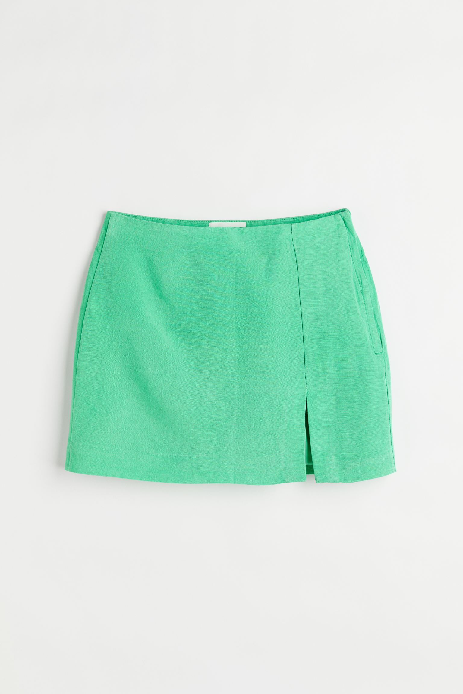Saia curta em tecido de mistura de linho e viscose com racha à frente. Cintura de altura regular com fecho éclair oculto de lado. Forrada.