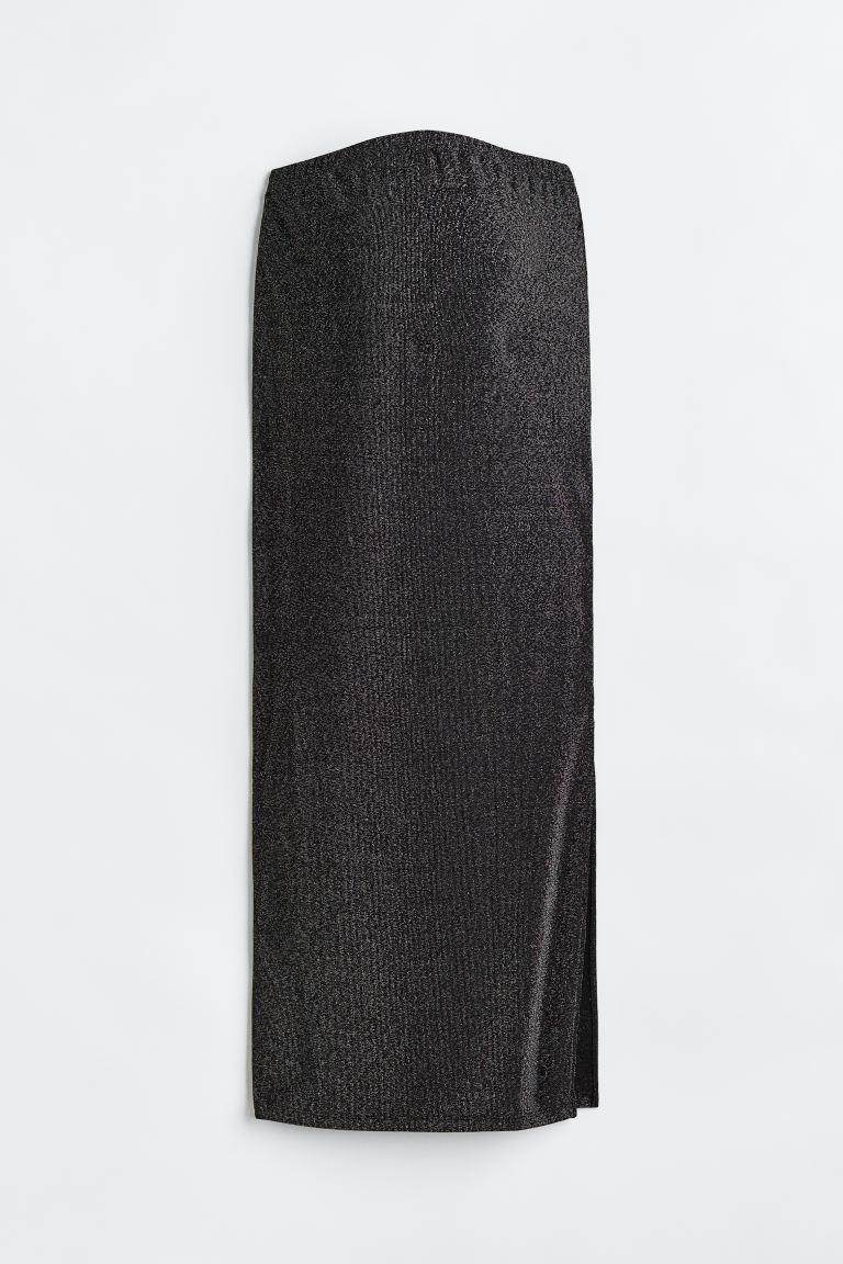Saia lápis justa, pelo meio da perna, em jersey com fios metalizados brilhantes. Cintura alta com elástico forrado e base direita com racha lateral num dos lados.