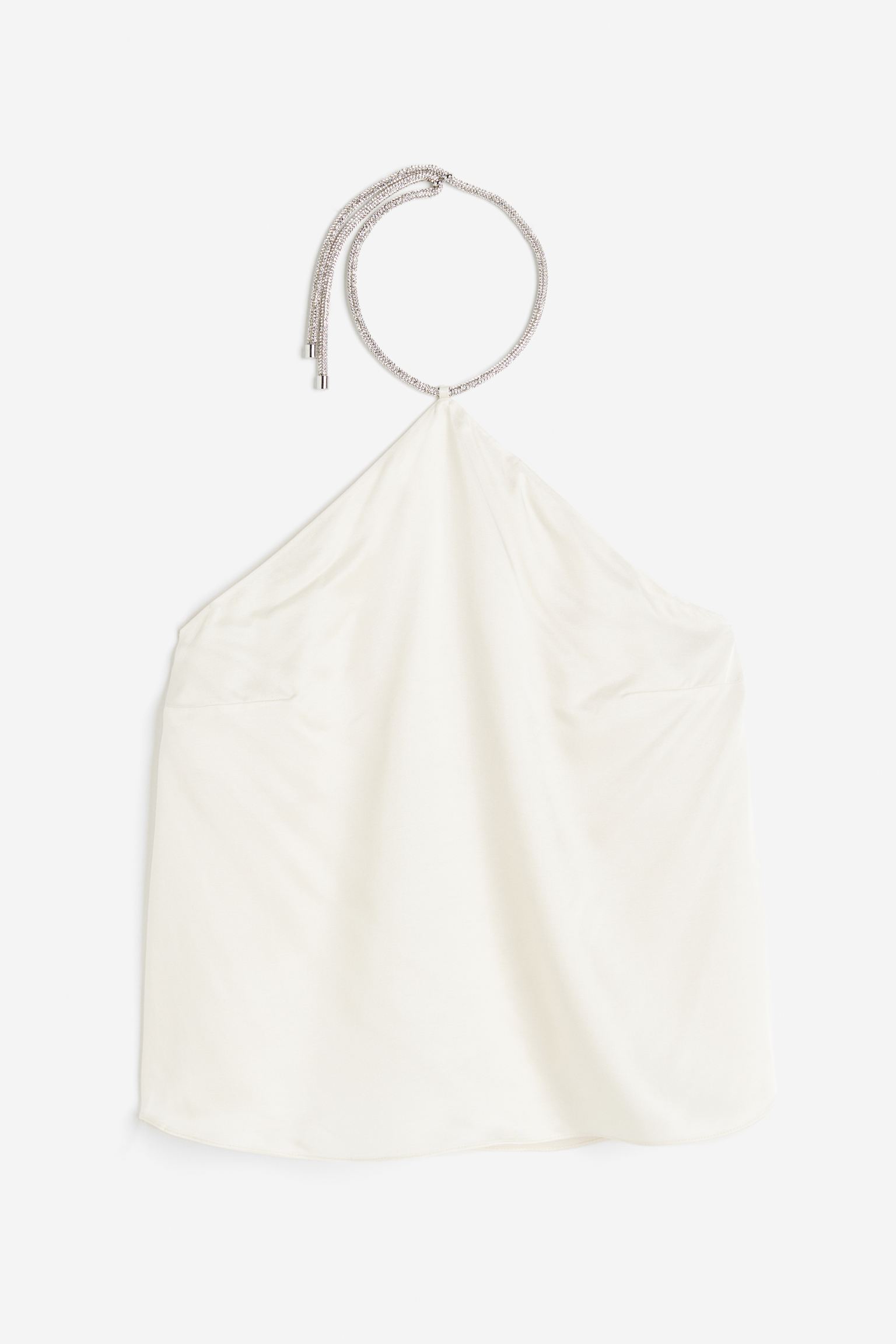 Top halterneck em cetim fluido com corte estreito em cima e uma alça redonda adornada com strass que fecha na parte de trás do pescoço.