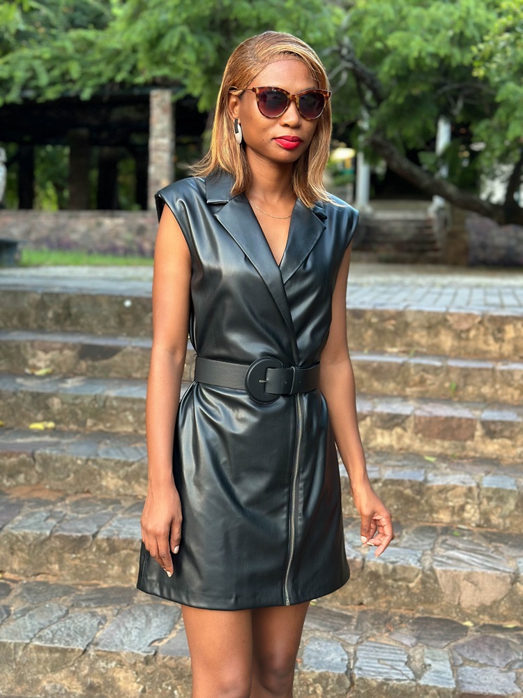 Vestido curto estilo colete, com gola e lapela, sem mangas, e ombros destacados. Possui bolsos laterais discretos costurados. Fechamento frontal cruzado com botão interno e zíper metálico. Acompanha cinto no mesmo tom para um toque adicional de estilo.
