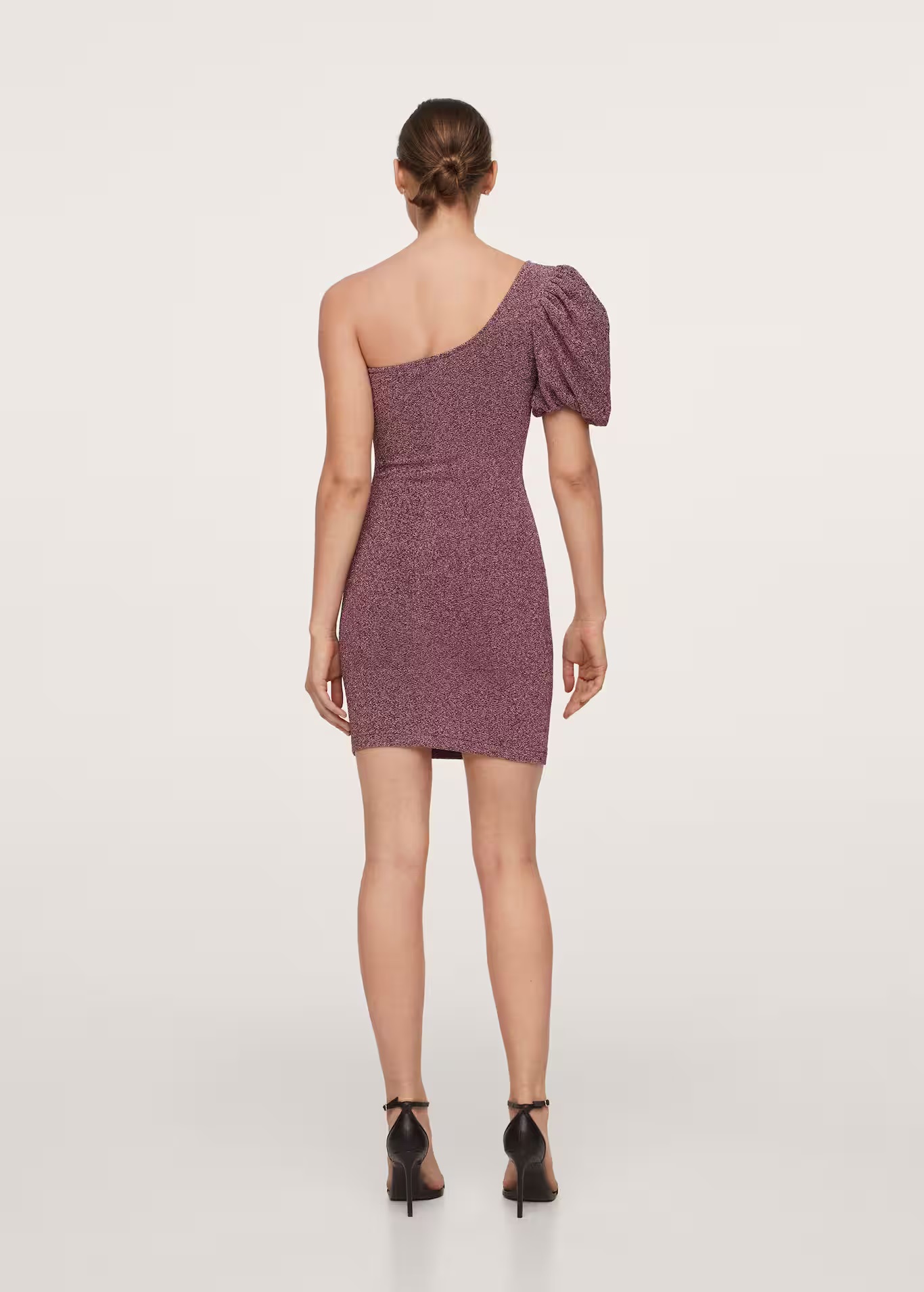Apresentando um acabamento brilhante e uma textura cativante, este traje exibe um corte reto e um comprimento curto, promovendo um visual moderno e audacioso. O decote assimétrico e as mangas curtas abaloadas acrescentam um toque de ousadia, resultando em uma peça curta, vibrante e contemporânea